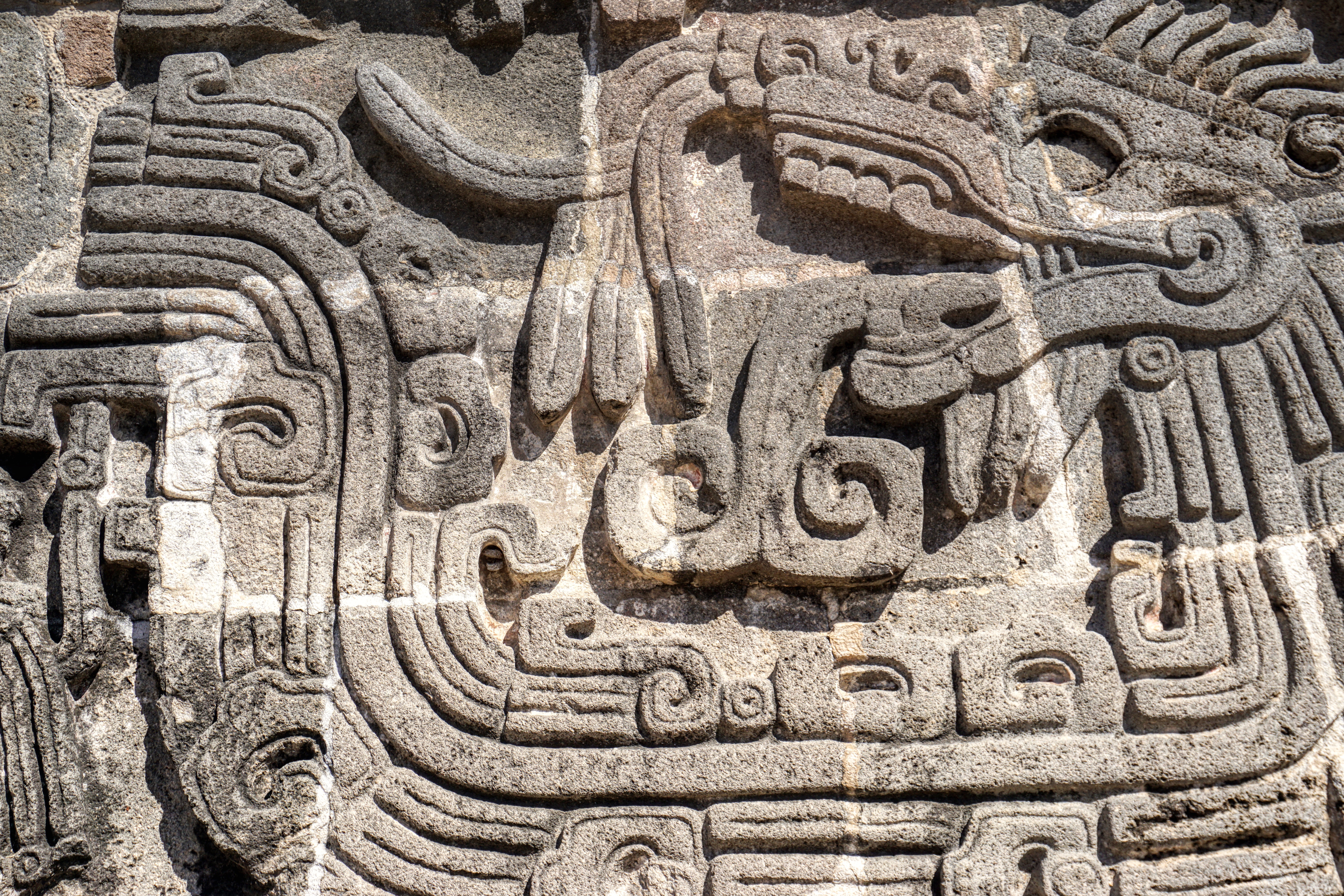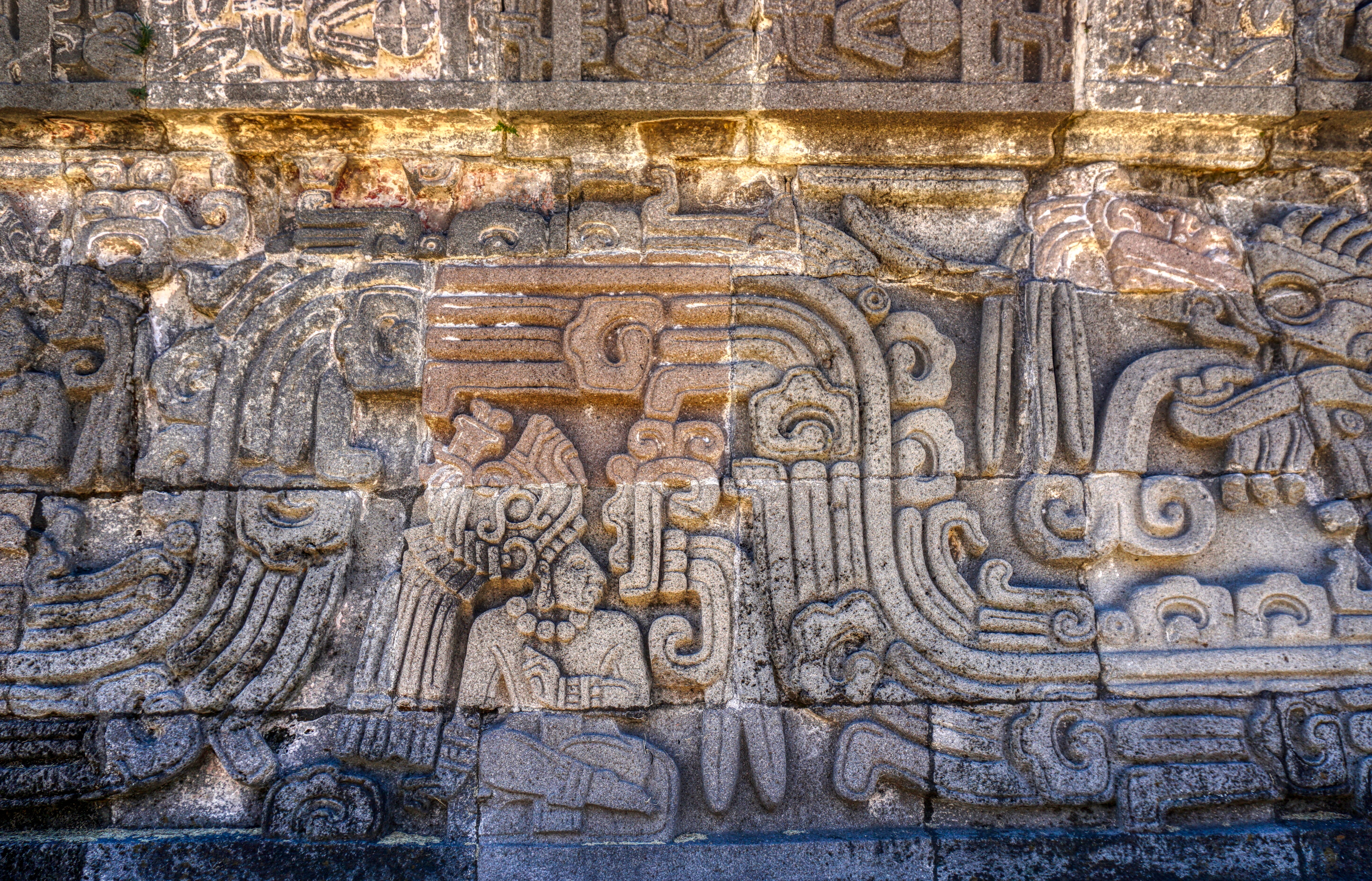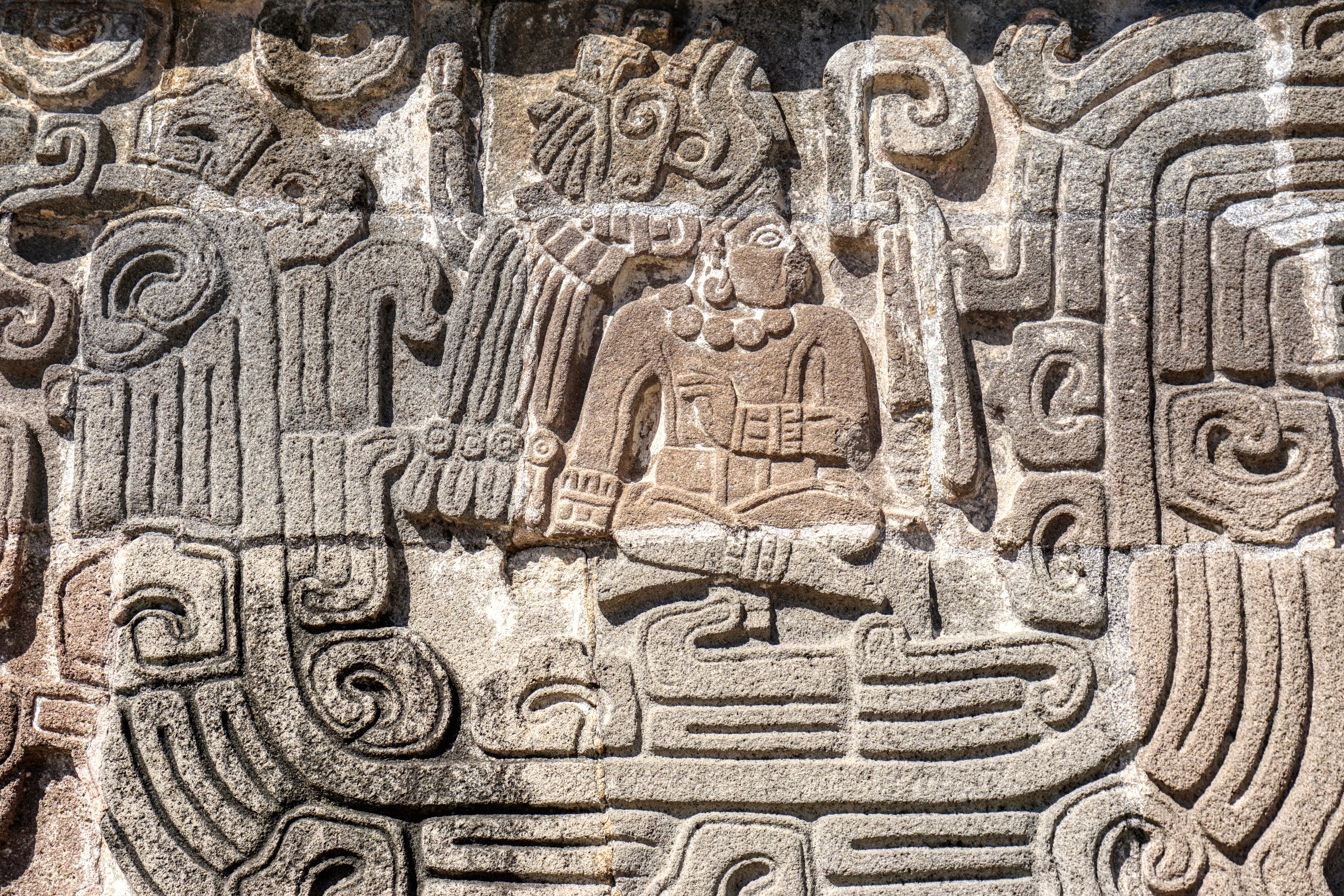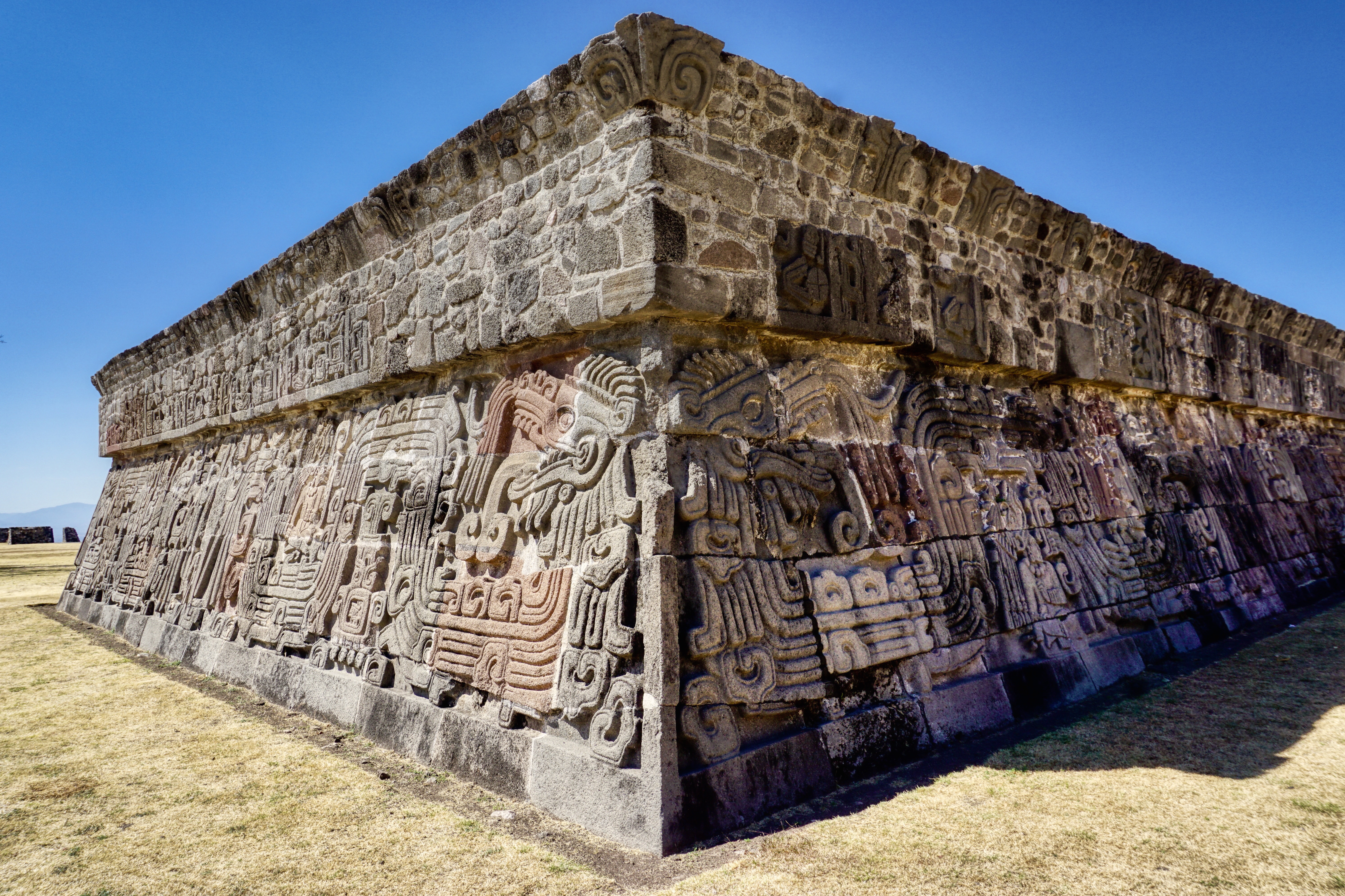 One of the most magnificent structures here is the Pyramid of the Feathered Serpent, Quetzalcóatl, positioned high up at the very top of the whole complex. The stone-carved relief around this pyramid is quite exceptional, with plumed serpents and men with elaborate headdresses, indicating a strong Mayan influence. Also carvings that depict towns which paid tribute to Xochicalco as well as several seated figures that look Mayan. Quetzalcóatl, the feathered serpent, is featured in many commanding friezes all around the temple. Incredible to think that all of this would have been highly coloured, dazzling in the bright hot sun.