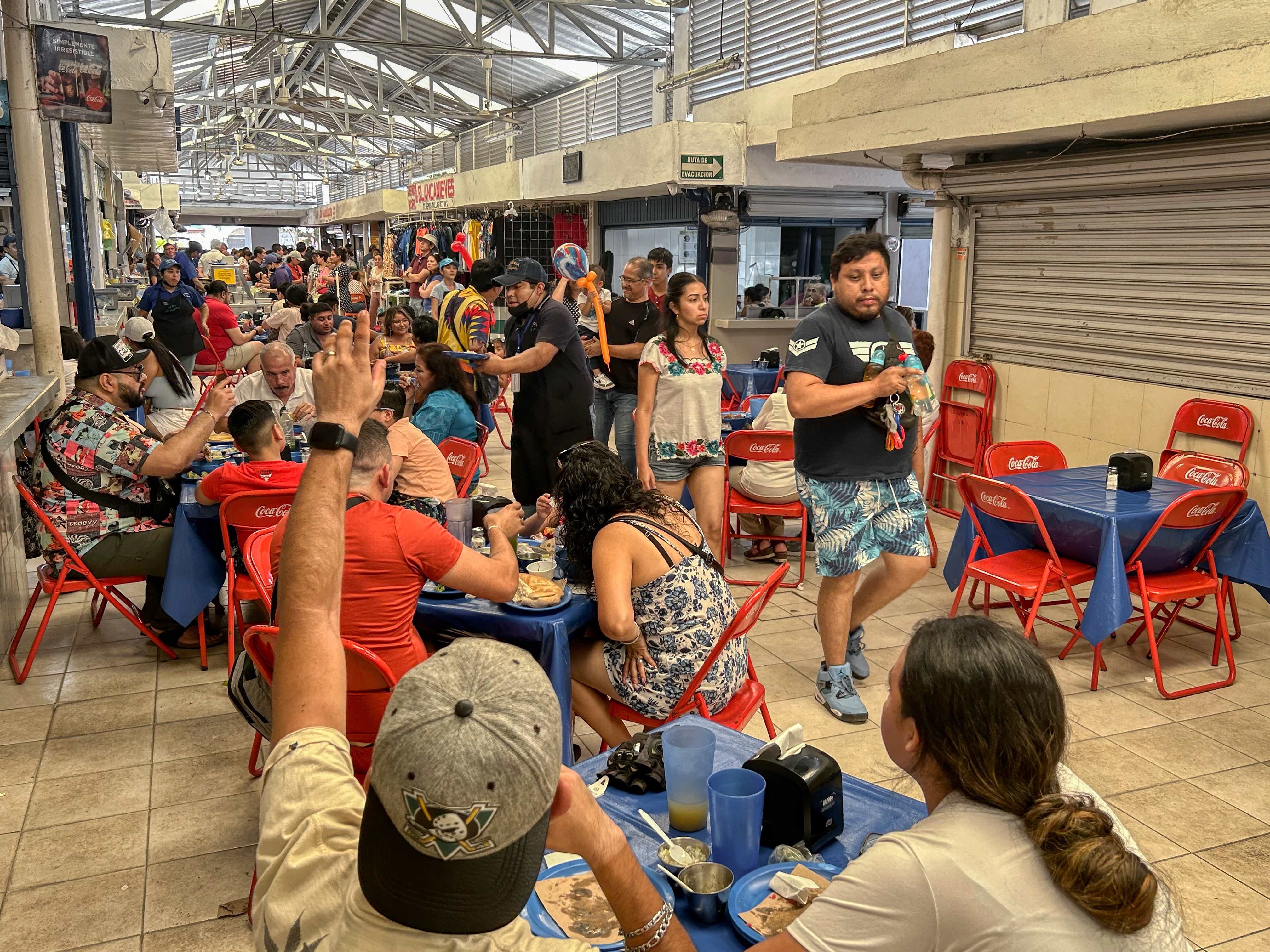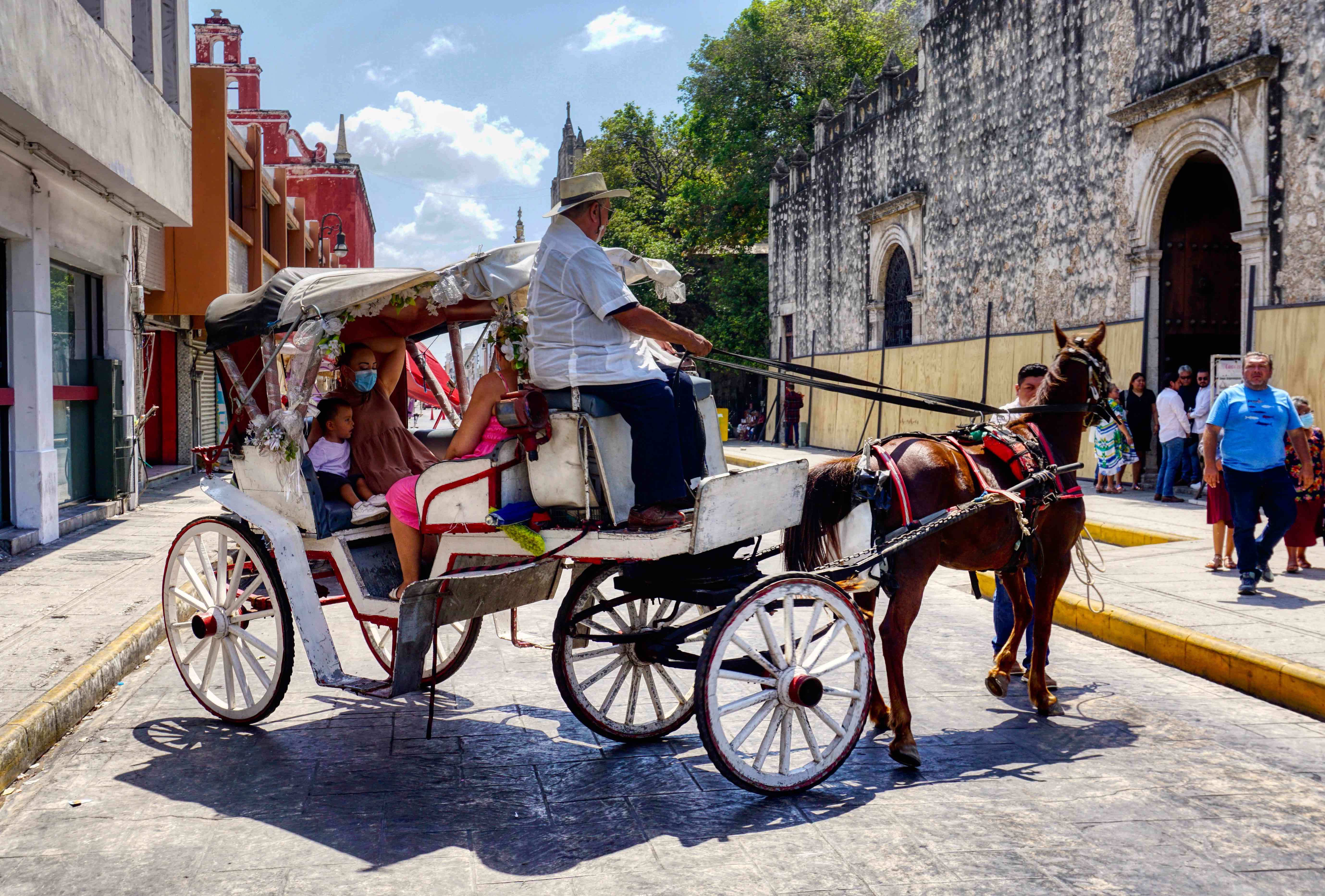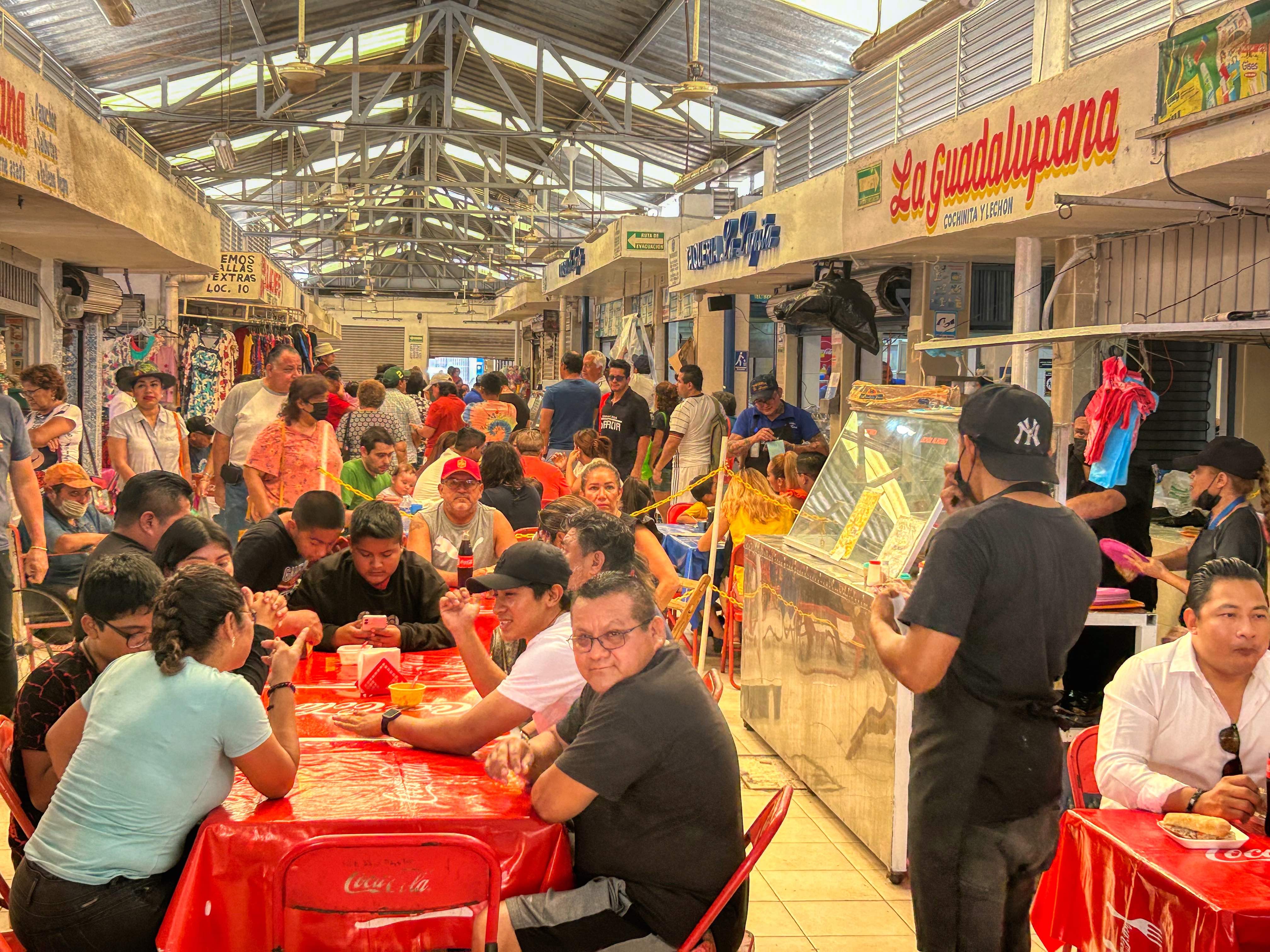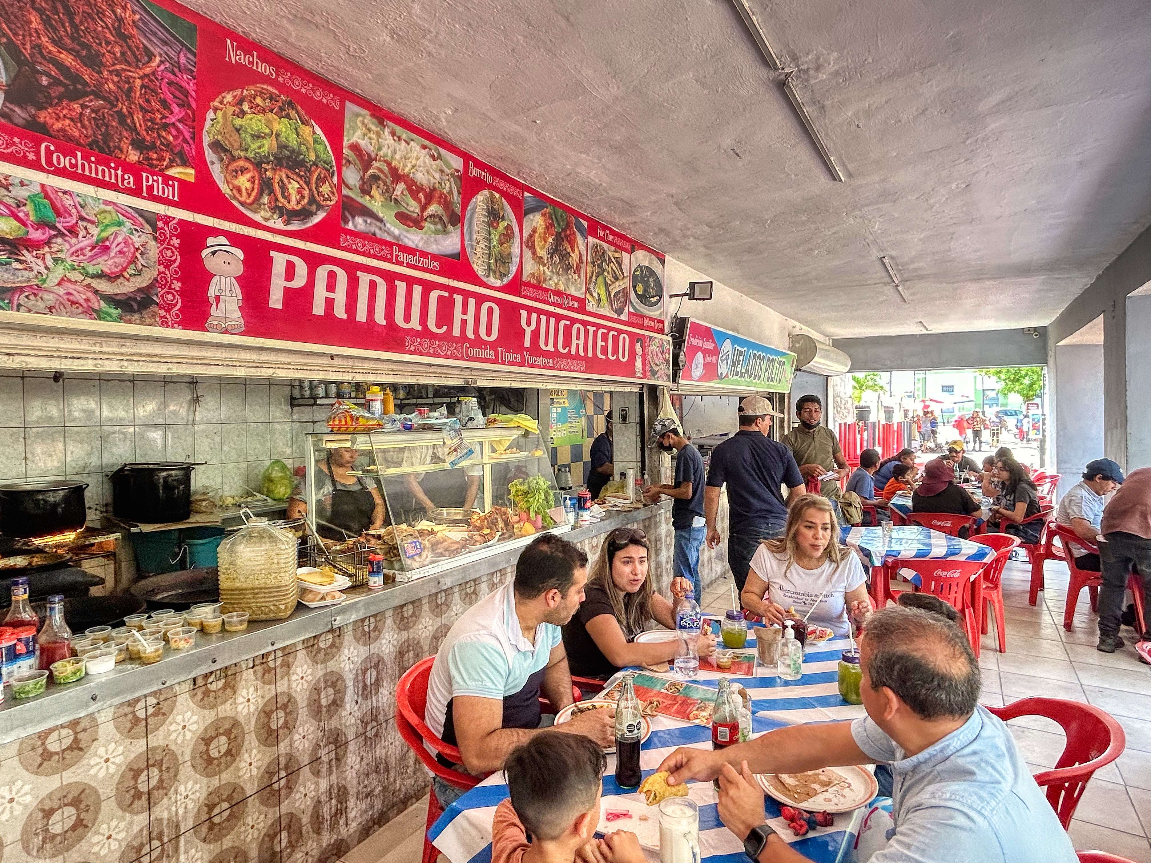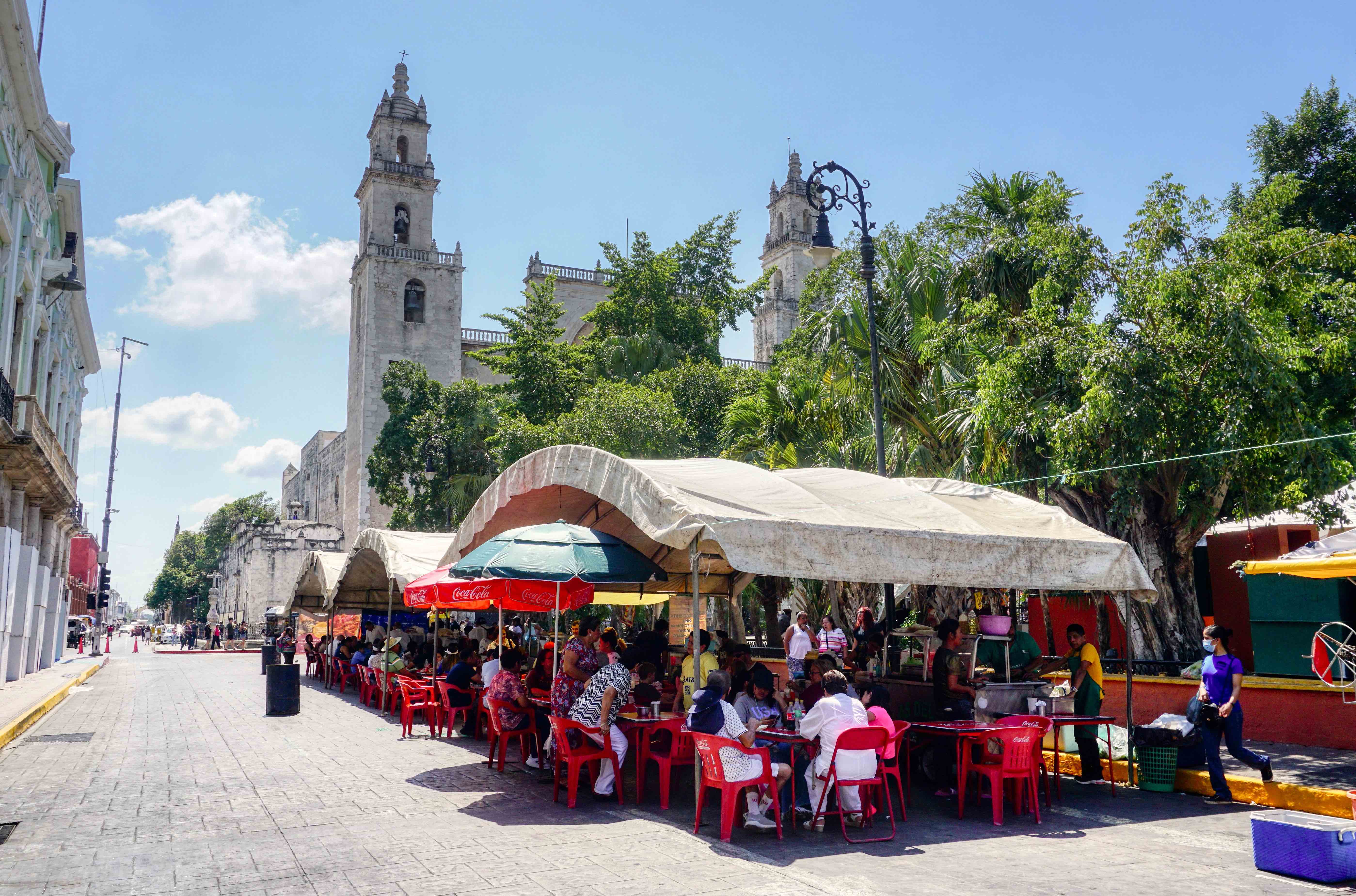 Here, the streets are empty but at key times such as today Pascua (Easter Sunday), after one of the many masses held in the many churches, the restaurants do throng with families. One very popular venue is our local hang, La Lupita, where, you guessed it, everyone seemed to be hoeing into mouth-wateringly delicious cochinita pibil, or that other Yucatan favourite, panuchos. The Cathedral was busy from early morning but outside and all the way around the Zocolo, street food stands had sprung up serving a feast of local snacks – papadzules, tamales, pozoles, sopa de lima, carne asada, tacos and tortas, chiles en nogada (stuffed chilli peppers) and the freshest corn tortillas known to man.