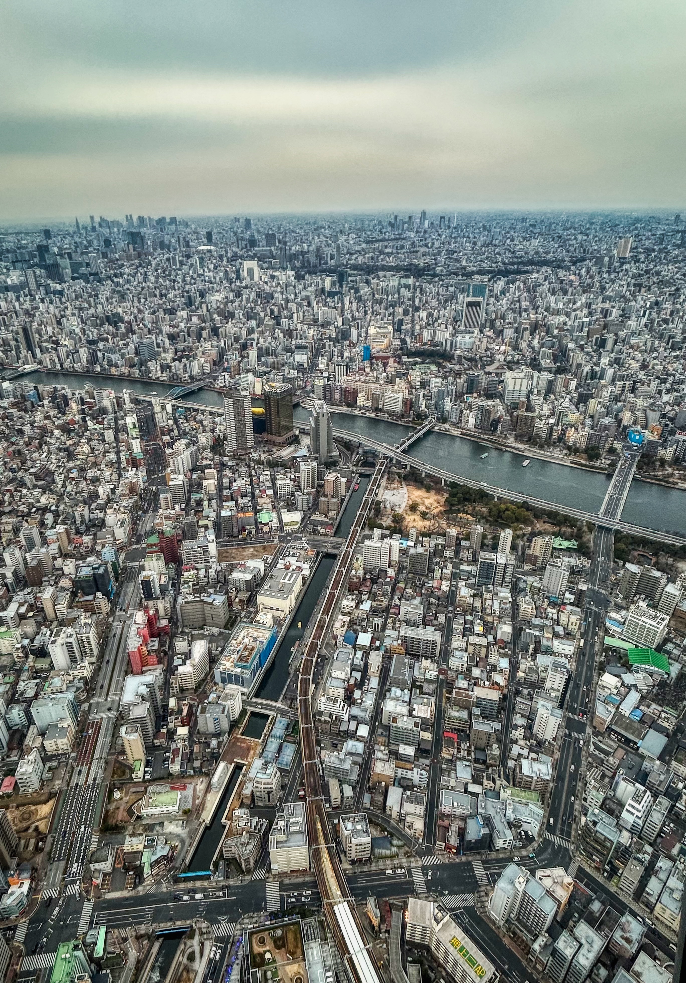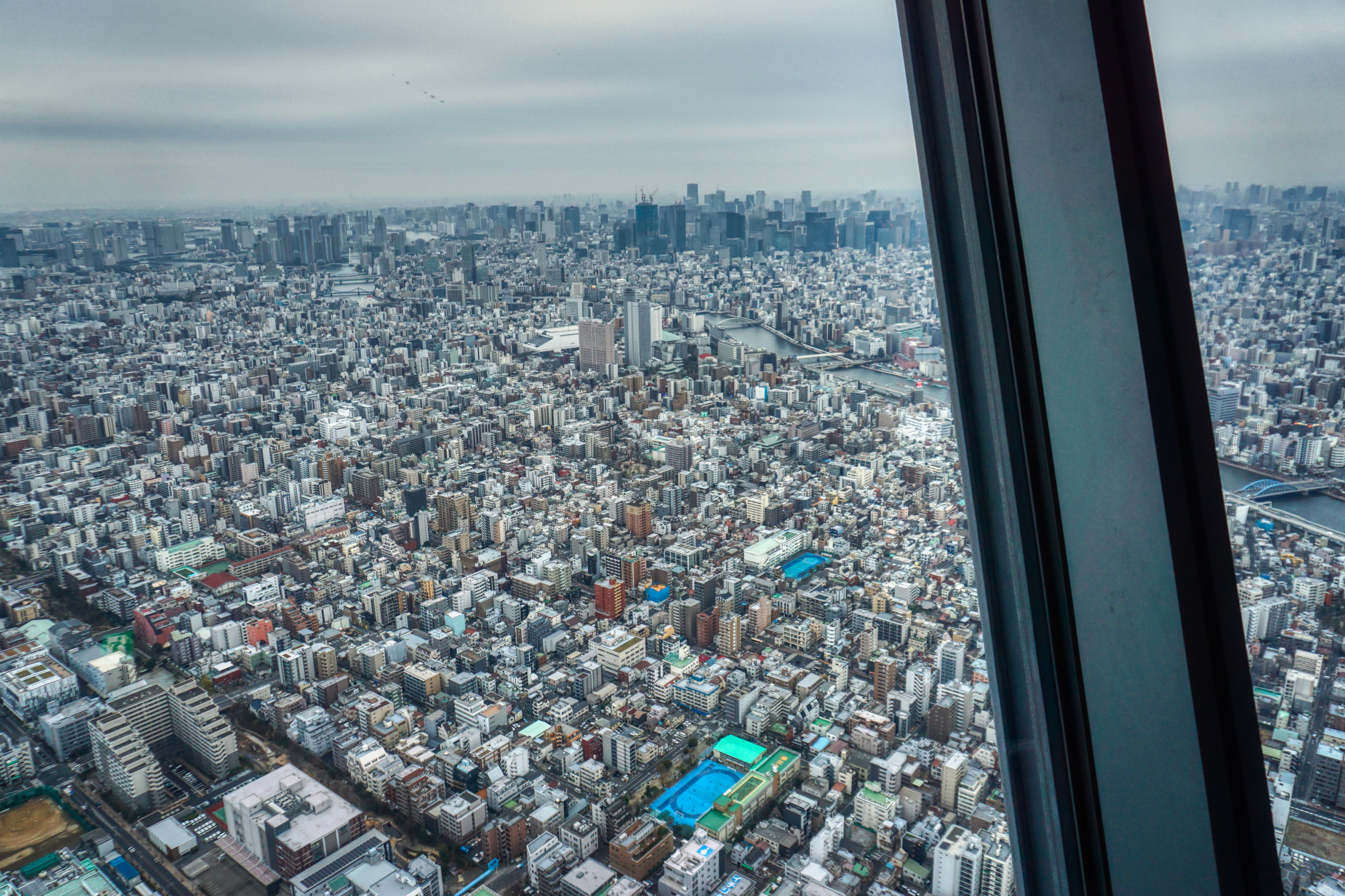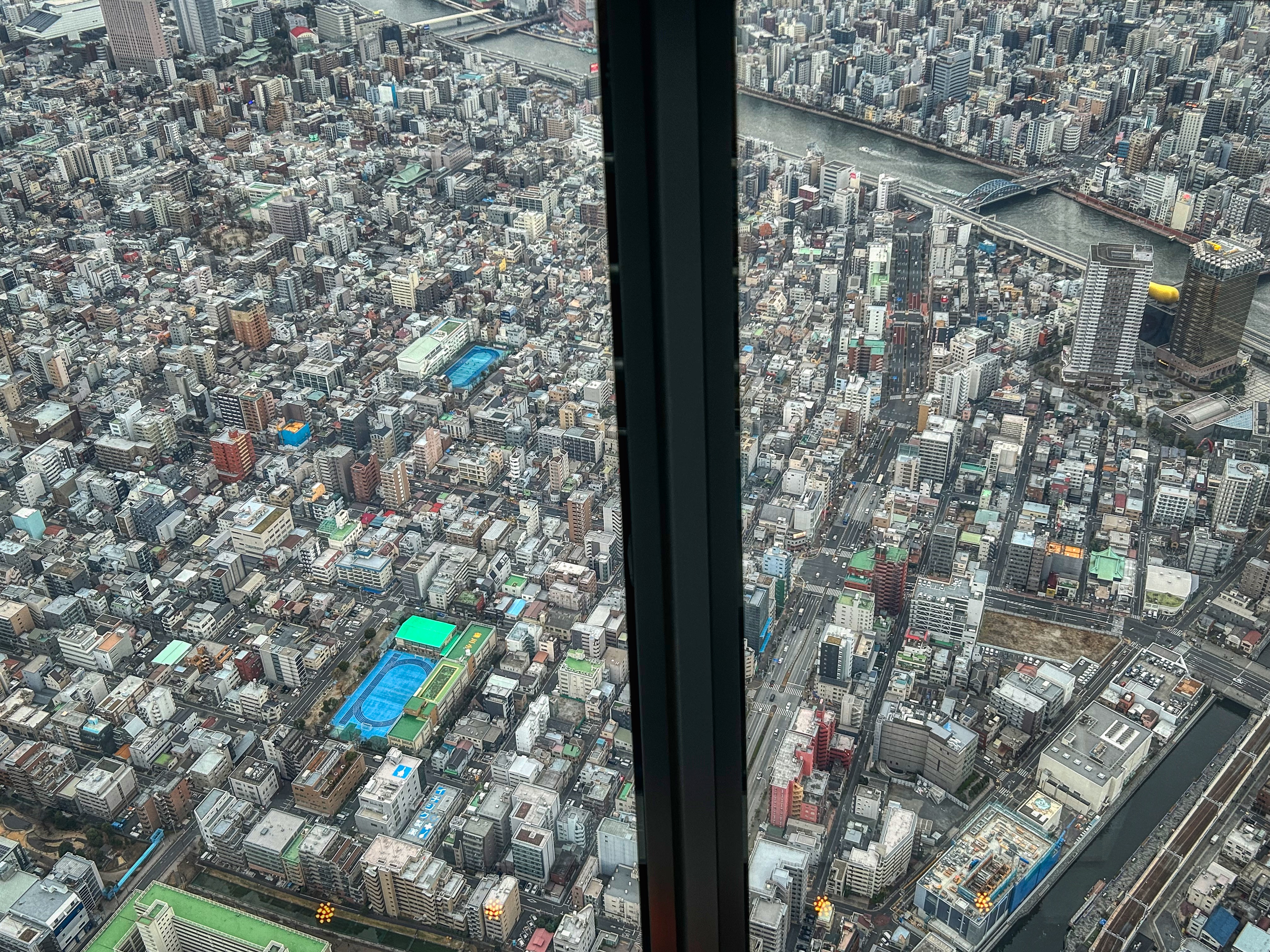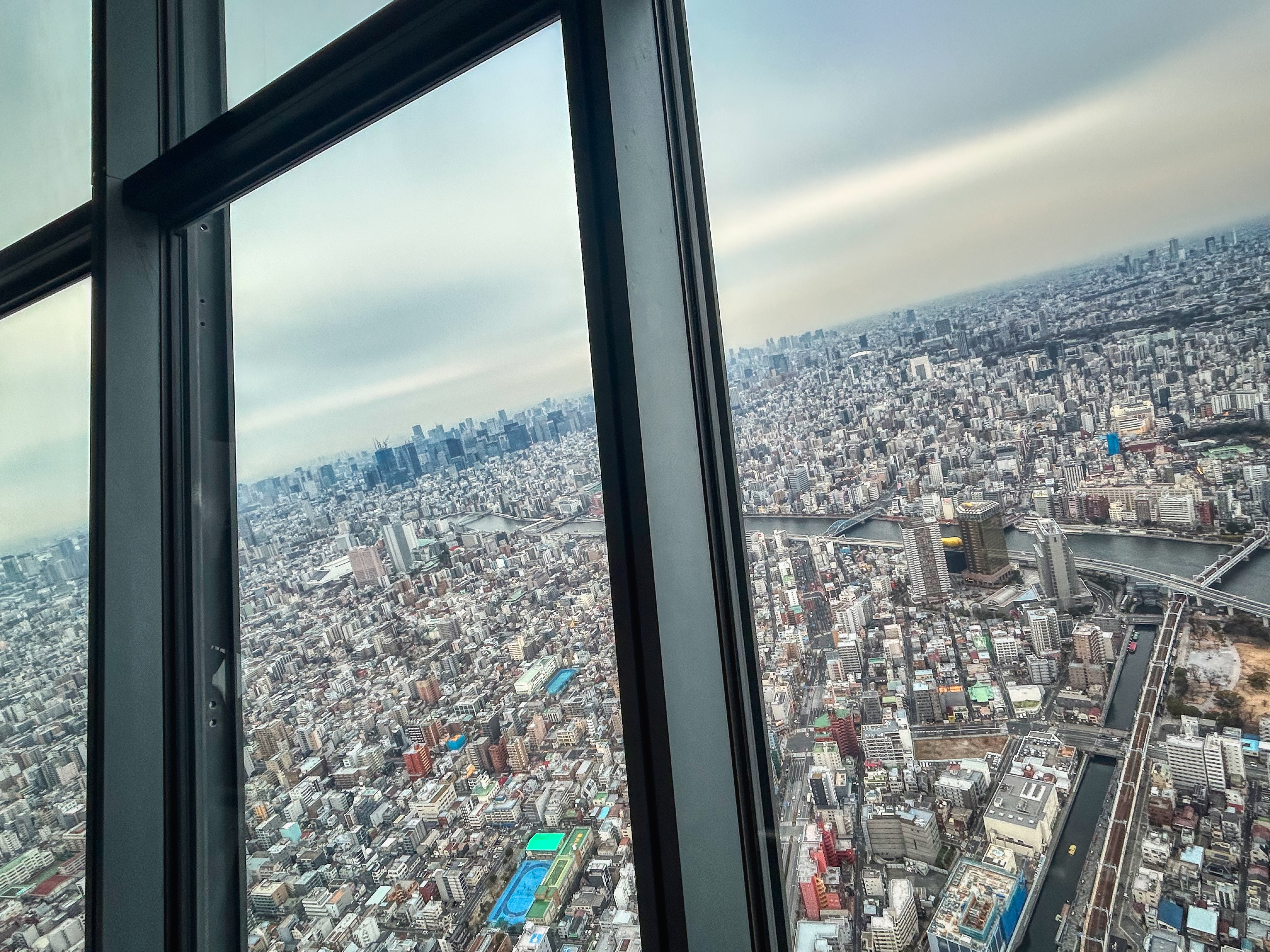Then the views are of course spectacular, but sadly on this murky grey old late-afternoon (we were aiming for sunset), Fuji was nowhere to be seen. However, the vastness of Tokyo is laid out below you as far as the eye can see (conditions allowing). I guess in hindsight we should have come early morning to get a clearer view but then who can know the weather. Today as I write it’s raining with low cloud. Tokyo Skytree from our hotel room has completely disappeared into the murk.