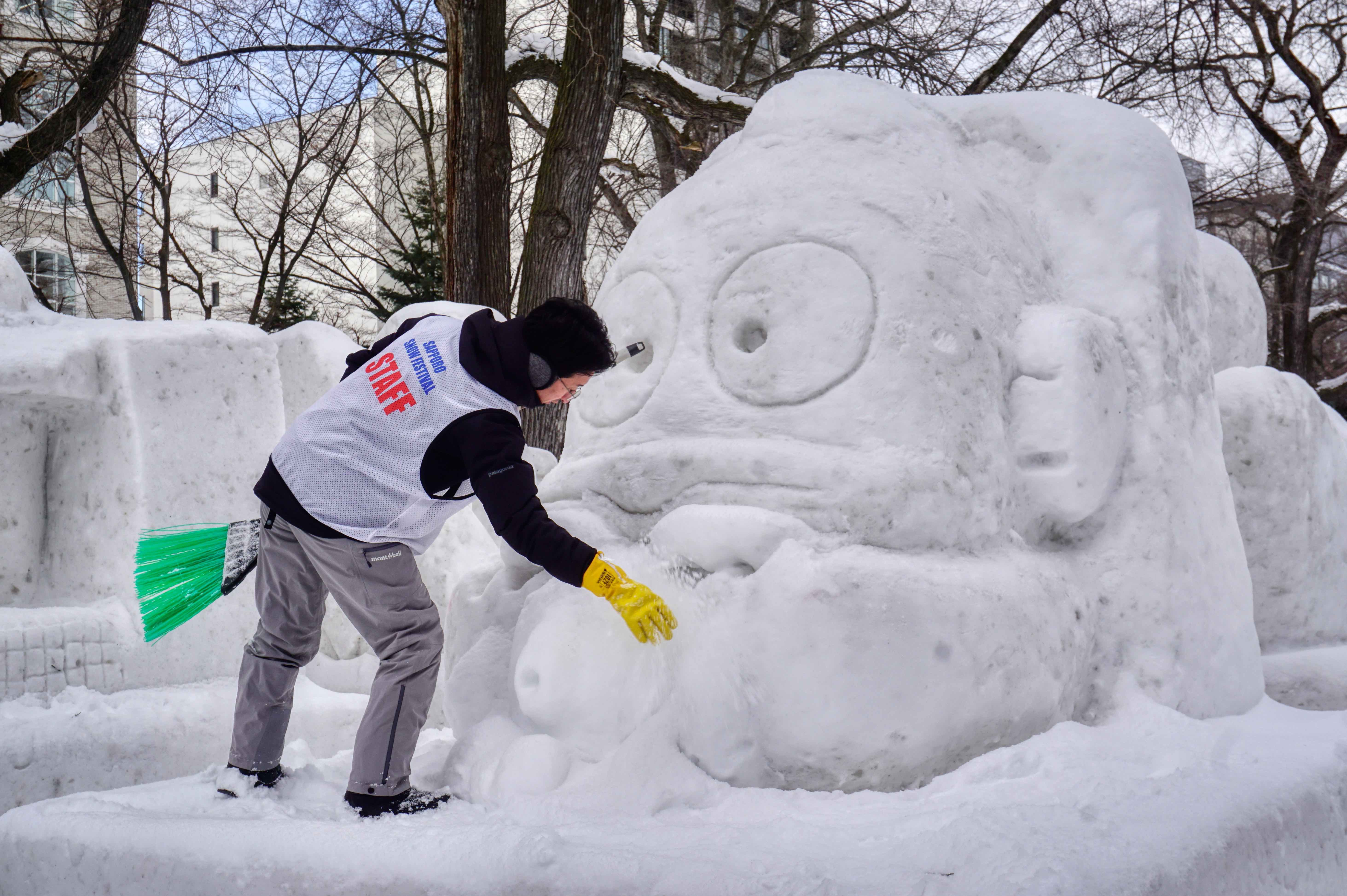 Sunday in Sapporo was blanketed by heavy snow that drifted across the city in frigid waves, delivering welcome sunny moments every now and again, but which became fewer and fewer as the day wore on. As a result, the snow sculptures looked a tad bedraggled, covered in fresh powder snow so mostly losing definition (and the battle).Help was on hand from an army of workers, armed with shovels and brushes in an attempt to regain their original form and character, but by mid-afternoon it was clearly a losing game and it seems they gave up for the day. The festival ends on Tuesday, so perhaps that’s a wrap for this year. Battle lost? But no! Despite the driving snow and frequent white-out, the crowds continued to be strong and, in many places, quite dense. There were large queues for the snow slides, freebie snack stands, the steaming food stands and the photo opportunity stands – regardless of the stinging blizzard that blasted through the site.