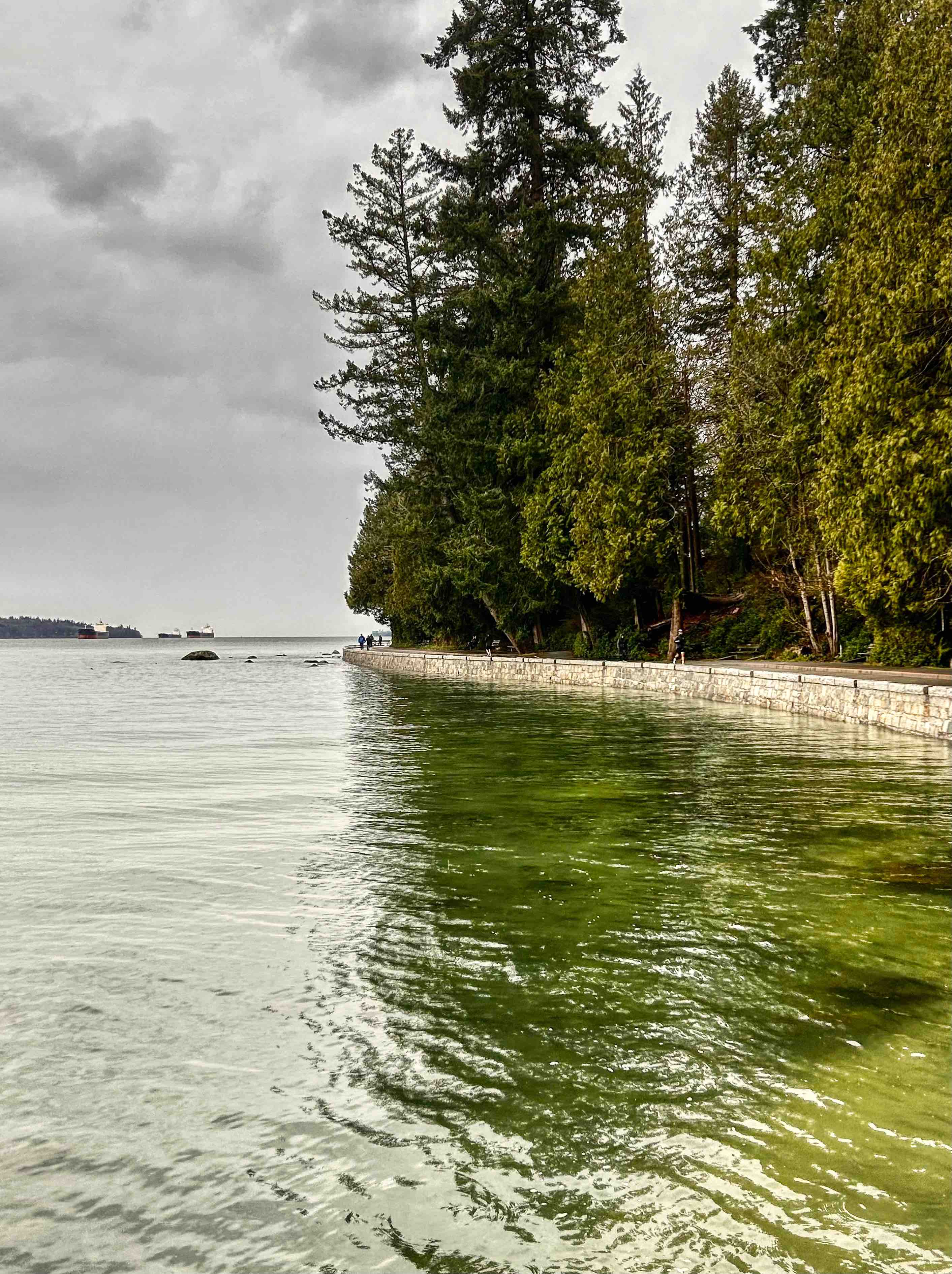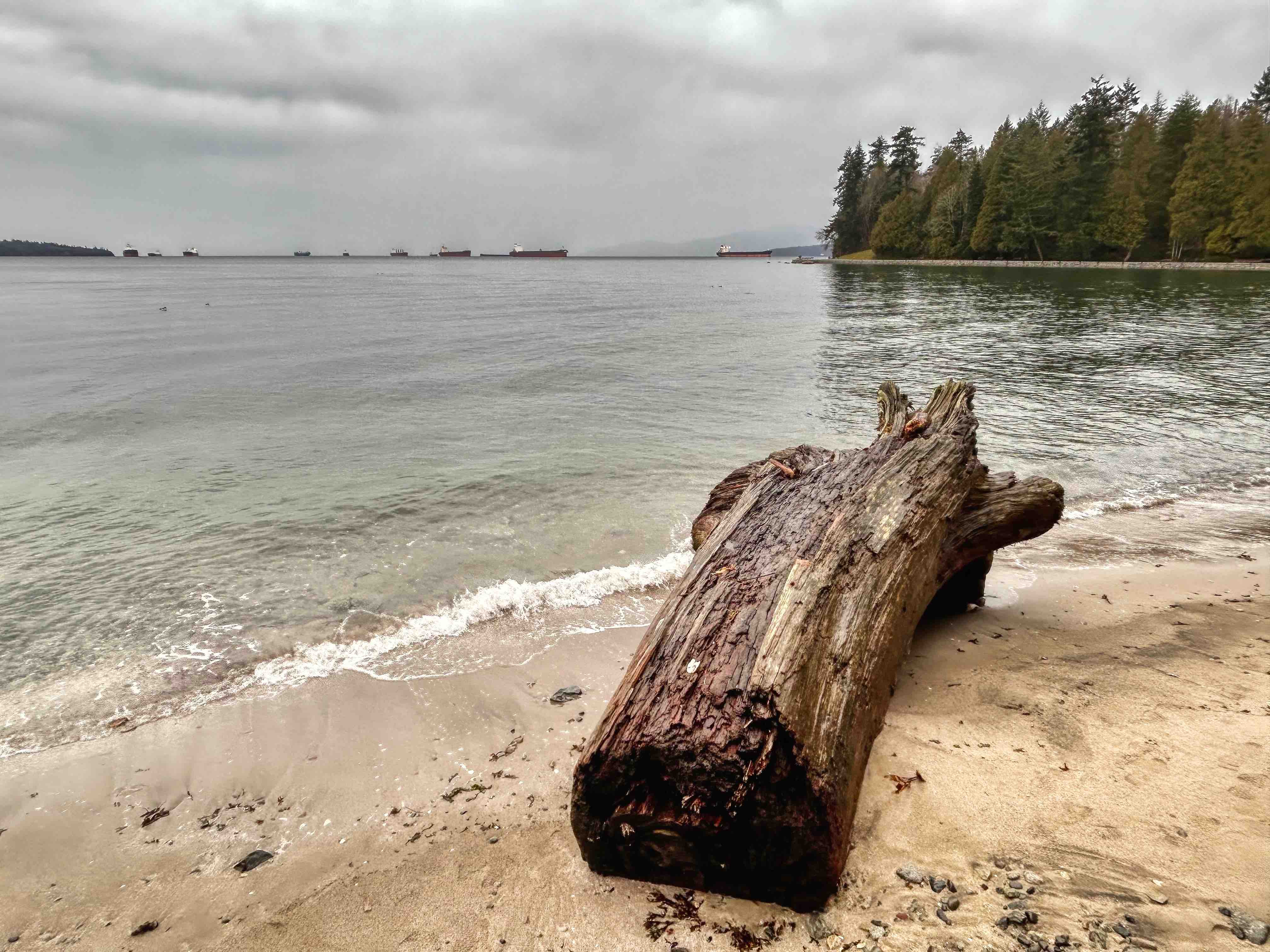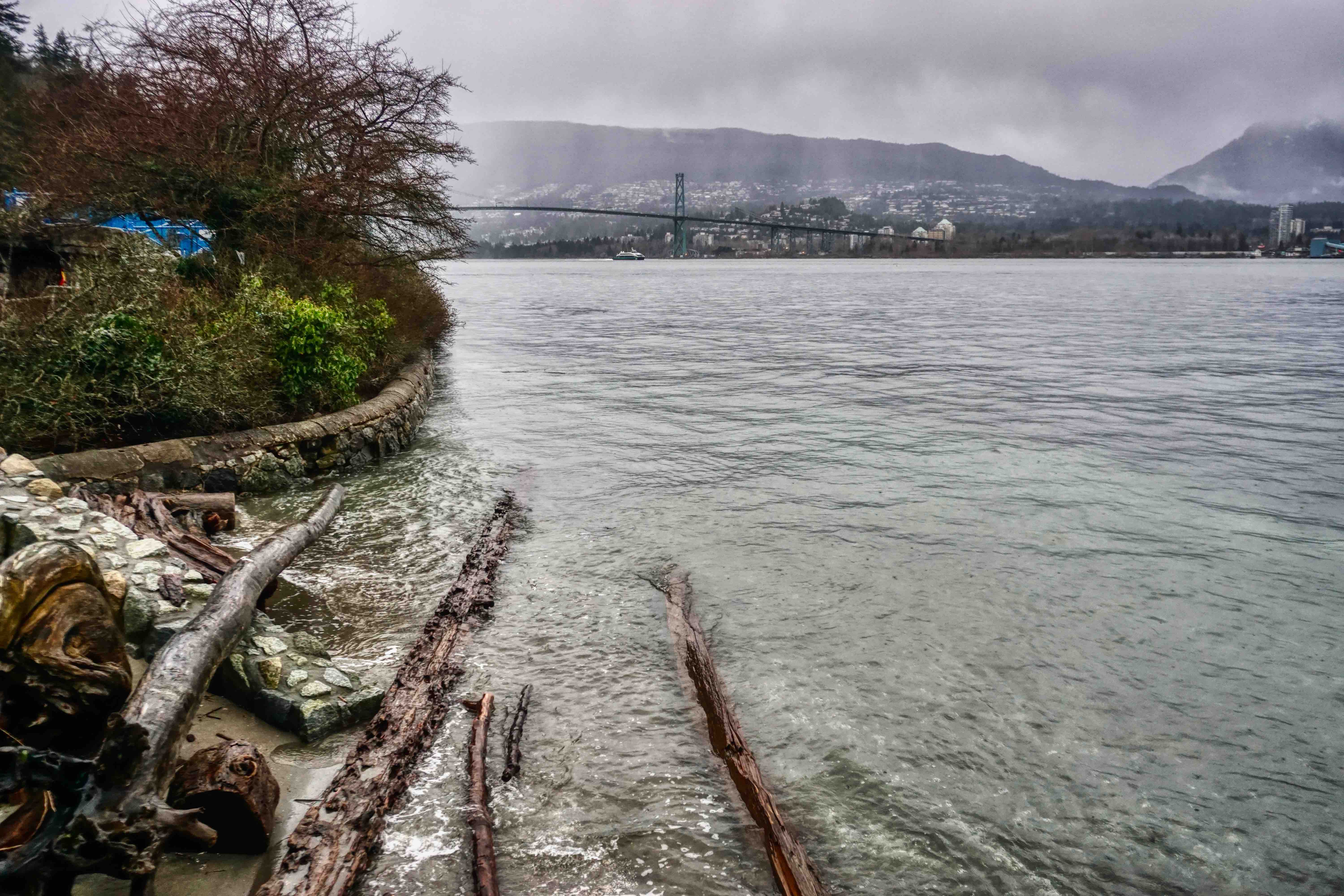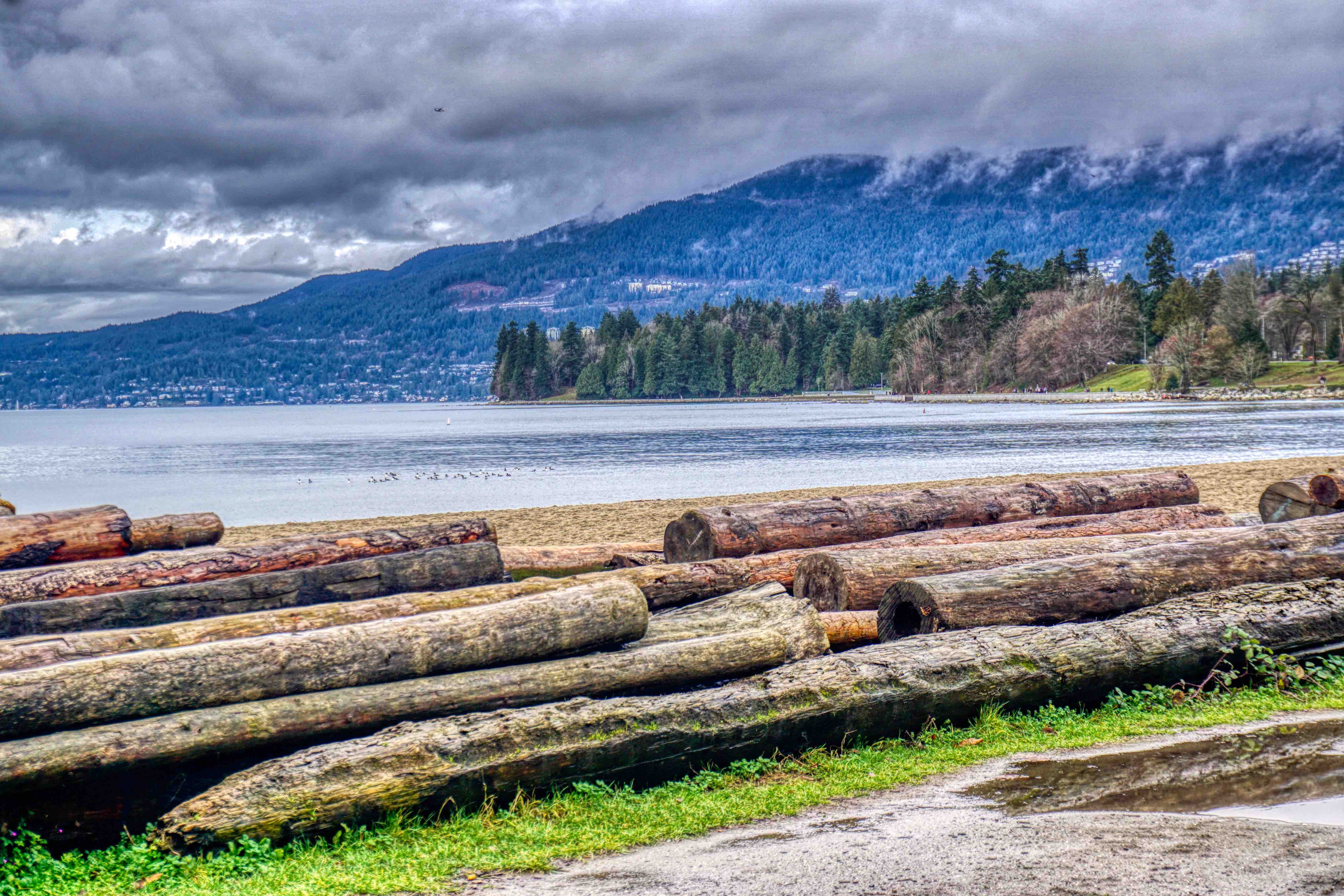 Stanley Park is Vancouver’s lungs at some 400 hectares and sits at the tip of the Vancouver downtown peninsula, capping the West End neighbourhood and surrounded by water on three sides – English Bay, Burrard Inlet and the Georgia Strait out towards the Pacific. The Seawall perimeter loop is some 10k’s all up and can take a couple of hours to walk, depending of course on the distractions along the way. Transferred by Uber and a very nice Canadian Korean driver (who donated us a ragged umbrella as the weather got suddenly worse), we set off from the Totem Poles, having already walked to that point last week, so I guess we had a couple of k’s up our sleeves. It was a miserable morning with steady cold rain, but unbelievably, shortly after setting off, we saw grey seals in the shallows just off the seawall. The water here is incredibly clear and, no doubt incredibly cold. Floating logs are common on Vancouver waterways, I guess from BC’s massive logging industry, and right along the seawall we saw piles of them, particularly in the coves and beaches, which you’d have thought would be a shipping hazard, but boats and ships of all sizes seem to cope with this floating minefield.