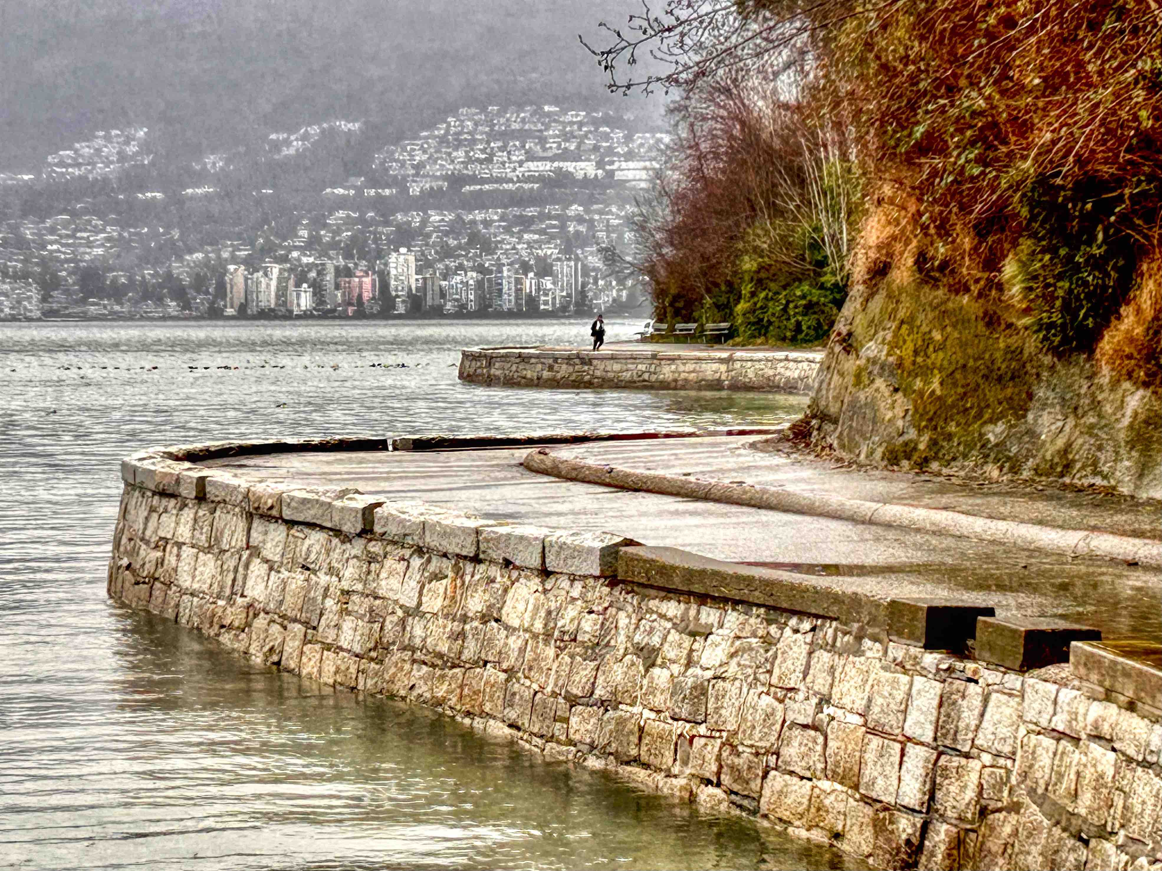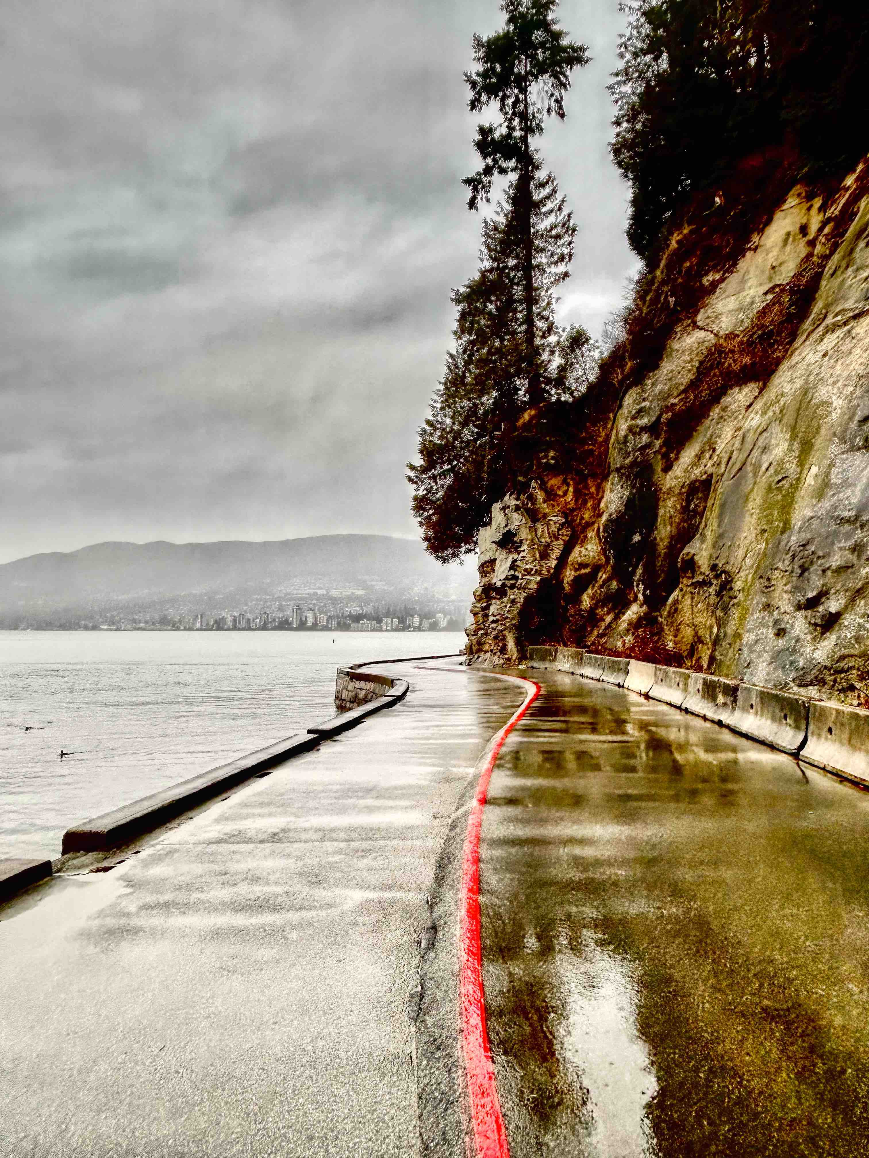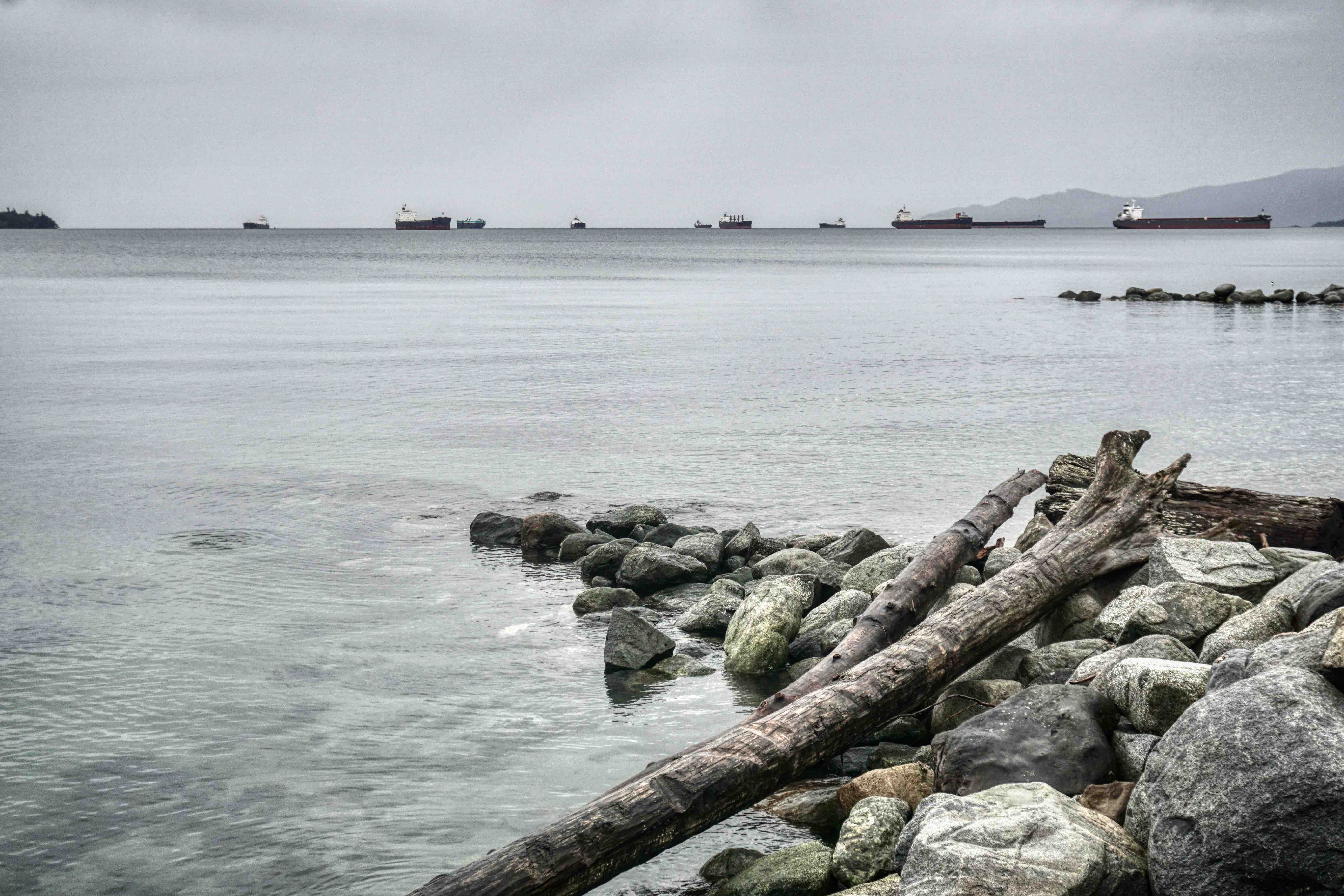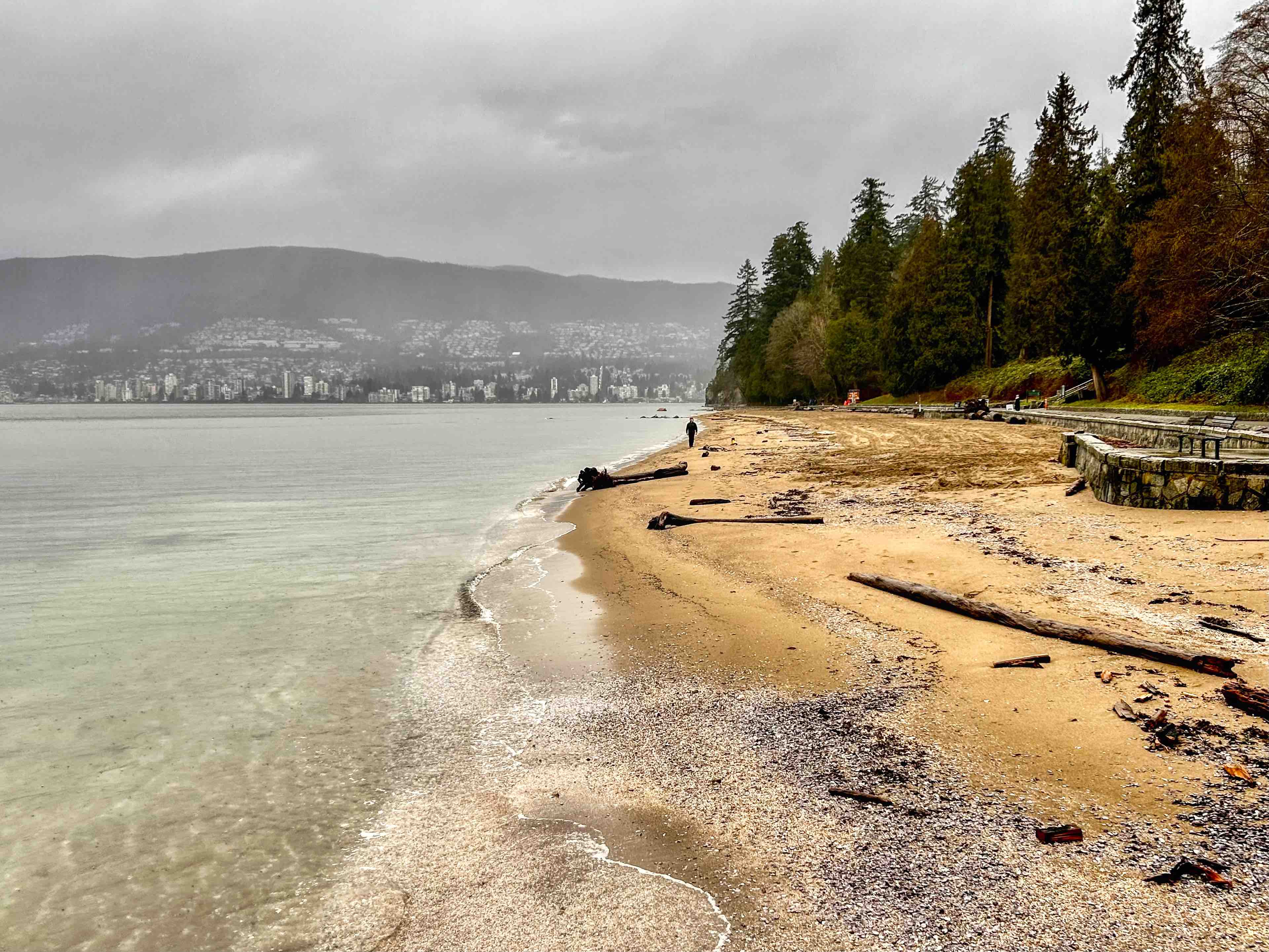 Stanley Park is Vancouver’s lungs at some 400 hectares and sits at the tip of the Vancouver downtown peninsula, capping the West End neighbourhood and surrounded by water on three sides – English Bay, Burrard Inlet and the Georgia Strait out towards the Pacific. The Seawall perimeter loop is some 10k’s all up and can take a couple of hours to walk, depending of course on the distractions along the way. Transferred by Uber and a very nice Canadian Korean driver (who donated us a ragged umbrella as the weather got suddenly worse), we set off from the Totem Poles, having already walked to that point last week, so I guess we had a couple of k’s up our sleeves. It was a miserable morning with steady cold rain, but unbelievably, shortly after setting off, we saw grey seals in the shallows just off the seawall. The water here is incredibly clear and, no doubt incredibly cold. Floating logs are common on Vancouver waterways, I guess from BC’s massive logging industry, and right along the seawall we saw piles of them, particularly in the coves and beaches, which you’d have thought would be a shipping hazard, but boats and ships of all sizes seem to cope with this floating minefield.