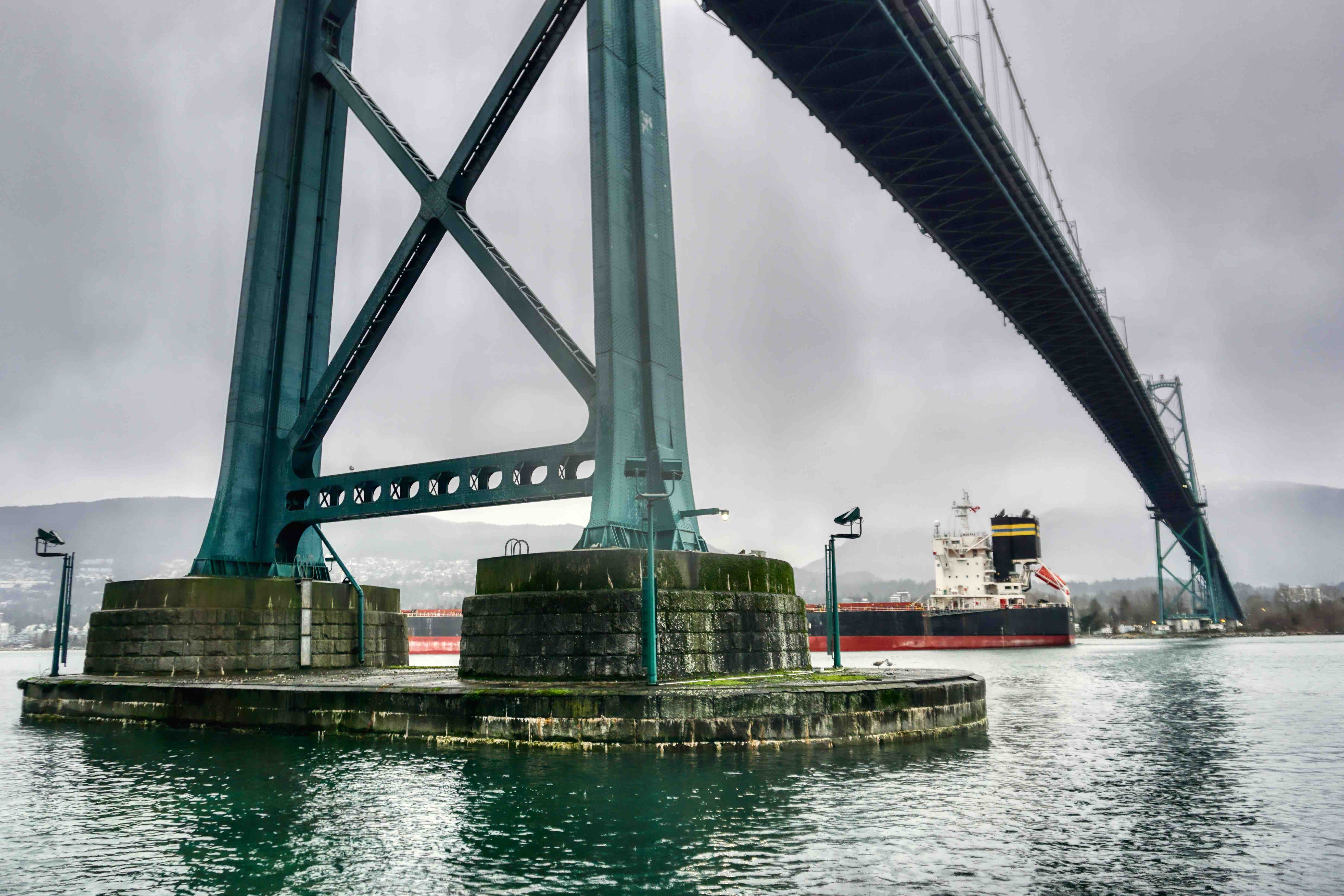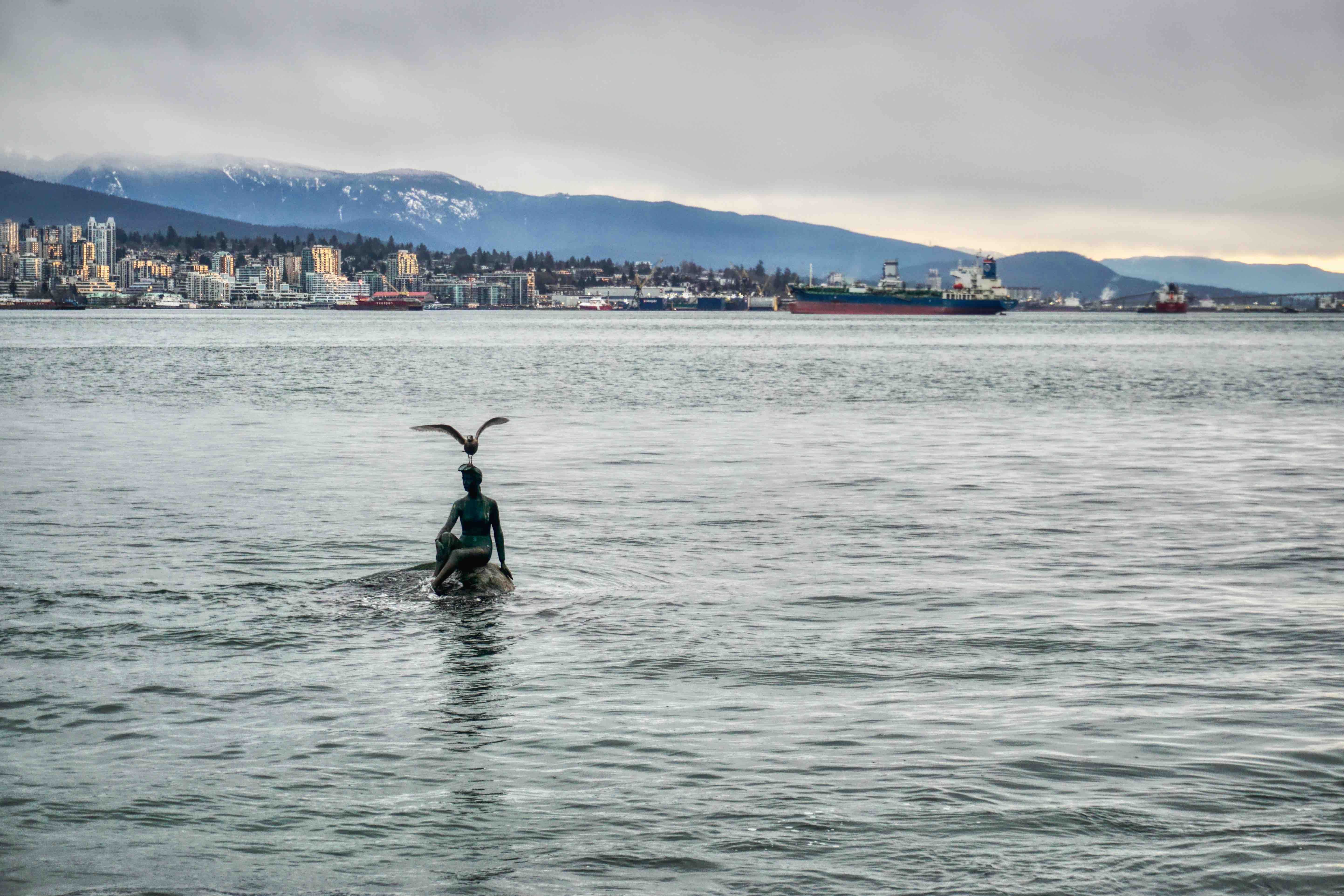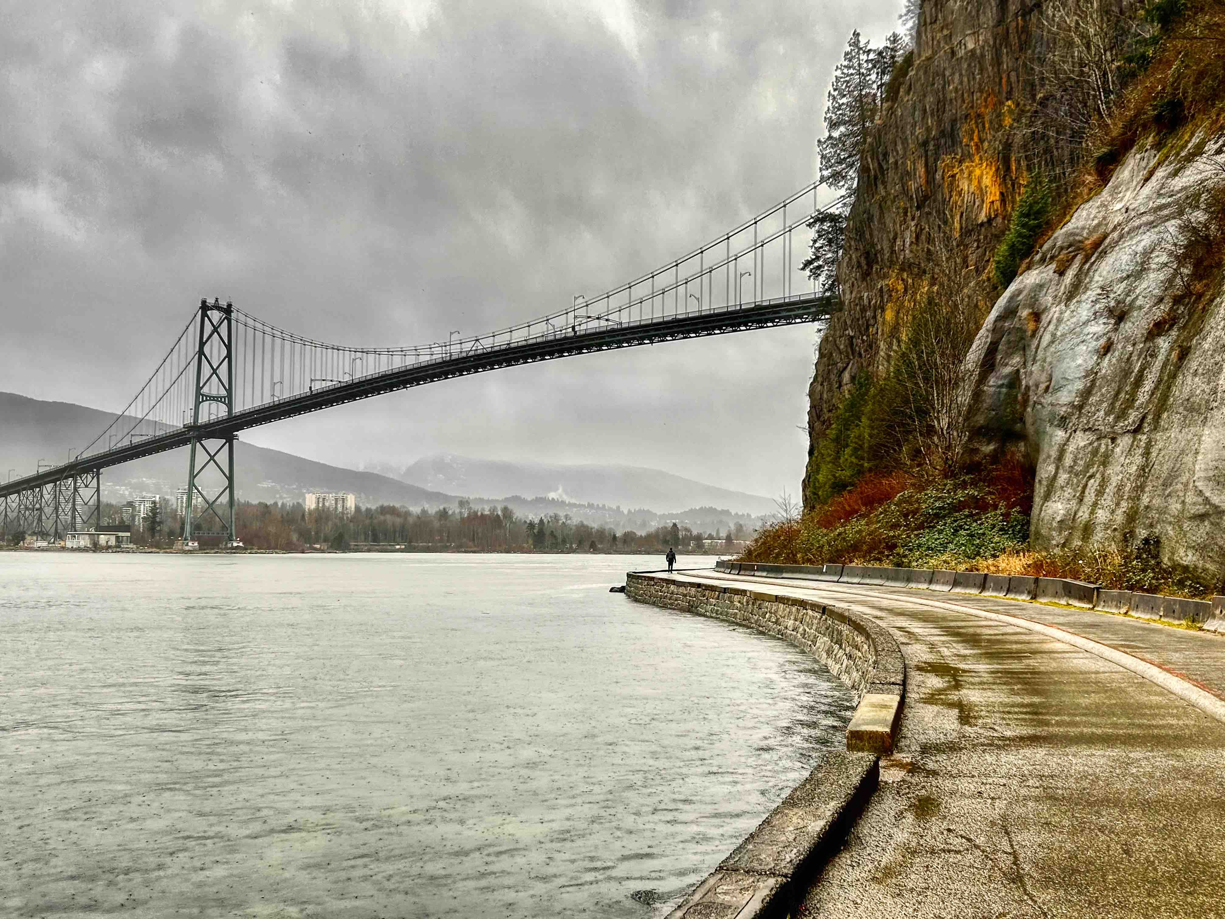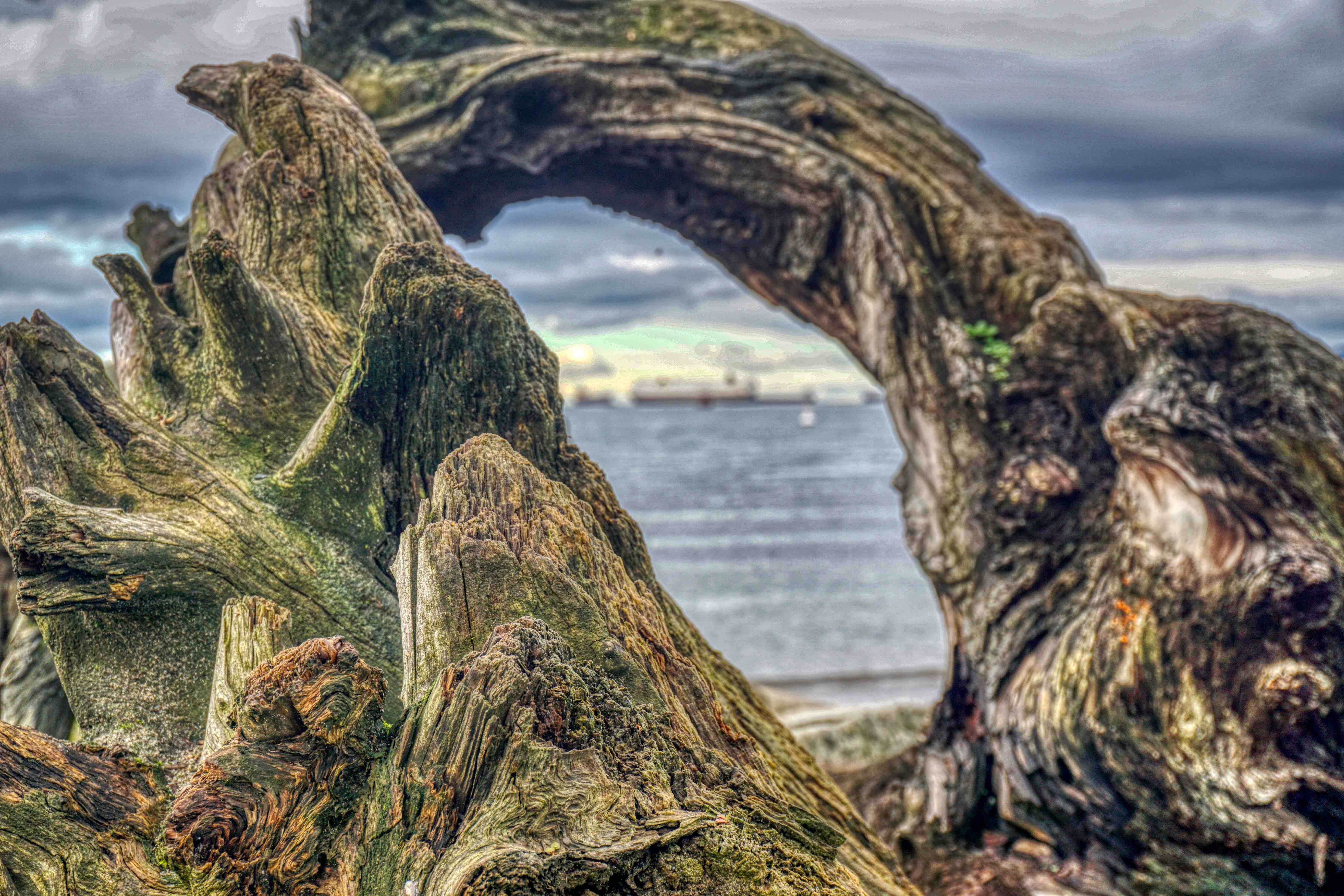 Stanley Park is Vancouver’s lungs at some 400 hectares and sits at the tip of the Vancouver downtown peninsula, capping the West End neighbourhood and surrounded by water on three sides – English Bay, Burrard Inlet and the Georgia Strait out towards the Pacific. The Seawall perimeter loop is some 10k’s all up and can take a couple of hours to walk, depending of course on the distractions along the way. Transferred by Uber and a very nice Canadian Korean driver (who donated us a ragged umbrella as the weather got suddenly worse), we set off from the Totem Poles, having already walked to that point last week, so I guess we had a couple of k’s up our sleeves. It was a miserable morning with steady cold rain, but unbelievably, shortly after setting off, we saw grey seals in the shallows just off the seawall. The water here is incredibly clear and, no doubt incredibly cold. Floating logs are common on Vancouver waterways, I guess from BC’s massive logging industry, and right along the seawall we saw piles of them, particularly in the coves and beaches, which you’d have thought would be a shipping hazard, but boats and ships of all sizes seem to cope with this floating minefield.