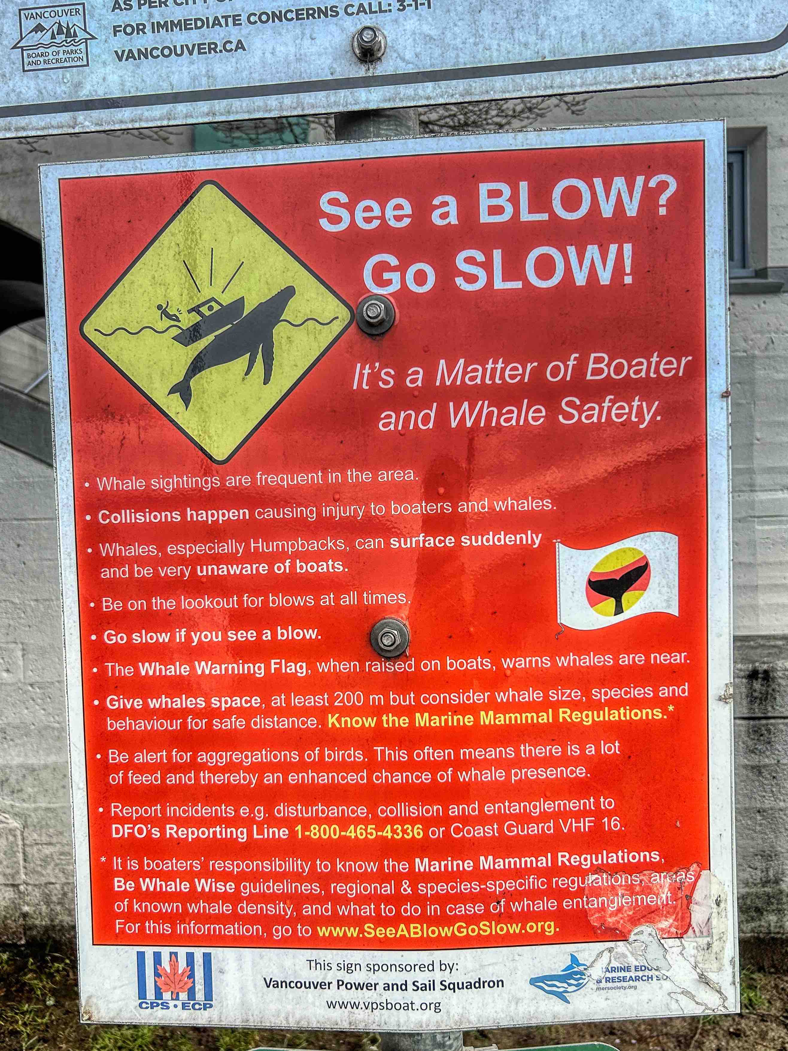 The other interesting sign that grabbed my attention was ‘See a Blow? Go SLOW!’ Not something you’d see on your normal city walk. But it’s intended for boat and Whale safety as Whales are often spotted in these waters such as Greys, and excitingly, Killer Whales (Orcas), attracted by the clear waters and abundant herrings in Burrard Inlet and False Creek. Now, that for one would get us back on this seawall, come rain or shine. We saw on Vancouver tv news that a pod of Killer Whales, not far up the British Columbia coast, is coming annually close to shore to slough off dead skin on beach rocks.